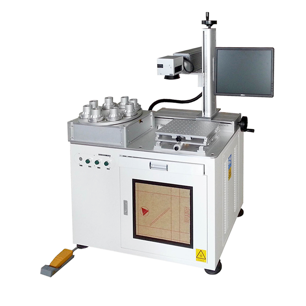 LED激光打標(biāo)機(jī)采用八工位(視產(chǎn)品具體情況可設(shè)計(jì)為6工位或4工位)3D立體旋轉(zhuǎn)轉(zhuǎn)盤設(shè)計(jì),光路X、Z軸手動(dòng)移動(dòng)可調(diào),單個(gè)工位之間獨(dú)立工作,自動(dòng)360°旋轉(zhuǎn),減少上下料時(shí)間,提高工作效率。適用于產(chǎn)量在10K/d以上的球泡燈、要求打雙面、三面或360°旋轉(zhuǎn)打標(biāo)的產(chǎn)品等,整臺(tái)機(jī)器的操作只需要普通人工進(jìn)行手動(dòng)上料一個(gè)簡(jiǎn)易環(huán)節(jié),雙工作臺(tái),平面打標(biāo),圓周打標(biāo)一機(jī)兩用,操作簡(jiǎn)單,速度快,效率高,標(biāo)刻清晰,無損耗。
