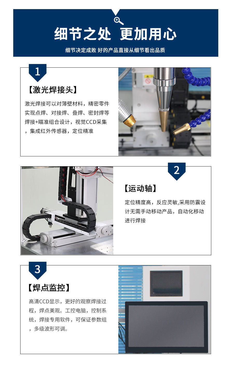 連續(xù)光纖激光焊接機由“焊接主機”和“焊接工作臺”配套組成,該系列設備擁有多款工作臺可選,是傳統(tǒng)光纖傳輸激光焊接機速度的4-5倍以上,完全能滿足不同行業(yè)用戶的需求。